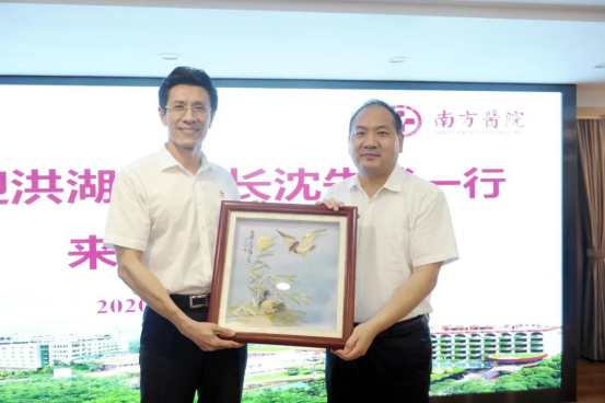 ▲洪湖市委副书记、市长沈先武向南方医院院长李文源赠与纪念礼物