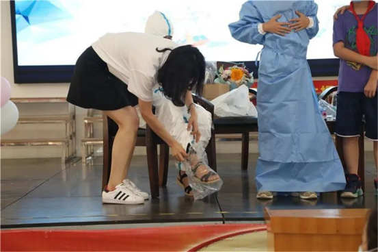抗疫“爱豆们”根据高、低年级学生不同的理解能力,用不同的讲解方式,活泼生动地为孩子们分享抗疫故事,介绍抗疫情况,讲解防疫知识;还现场和同学们互动穿戴防护服的过程。同学们亲身体验,直观的展示,生动感人的讲述,向小学生们传递满满的正能量。