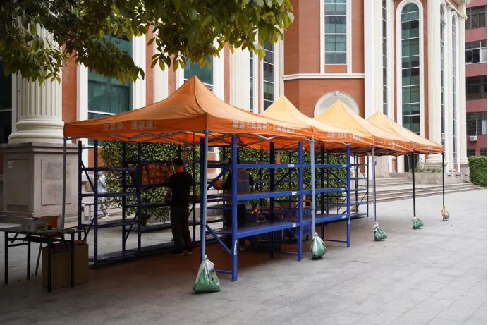 校本部教学区实行封闭管理。为确保教学区学生正常生活学习,学校在教学区学生食堂二楼前厅设置了生活物资服务点和快递临时配送点,所有进入教学区的生活物资进行全方位消毒后,由专用车送达,10:00-22:00展开服务。生活物资服务点重点保障洗化纸品区、百货区、文体用品区等250个品项,同一批购置物资数量较多时,将开通预订出售方式,并送货上门。