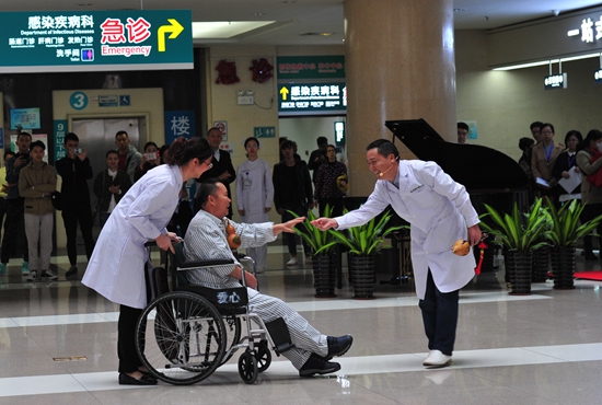 在医患共同演唱的《今天是你的生日》、《歌唱祖国》等歌声中,珠江医院院领导为患者发放“建院七十周年倾情回馈社会”爱心药包。