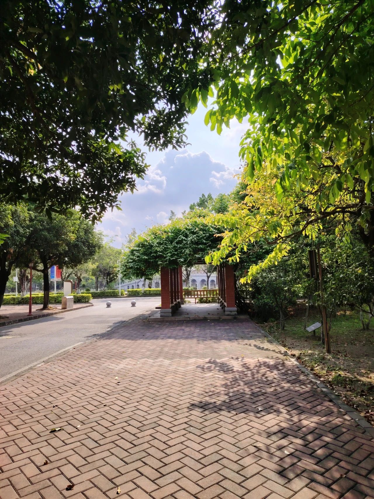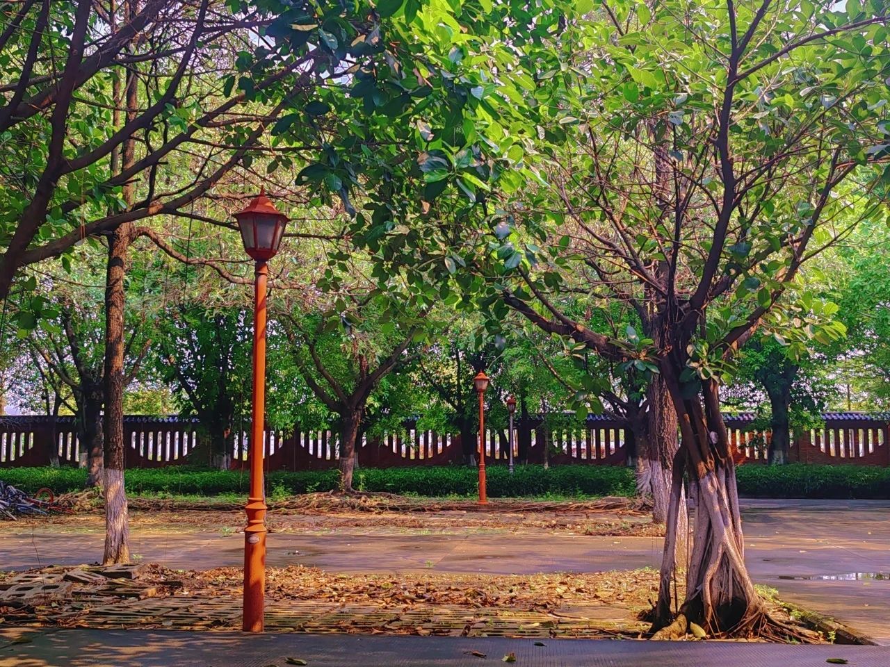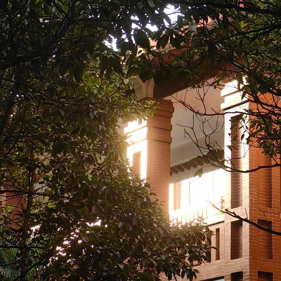 阳光流转在砖红瓦绿