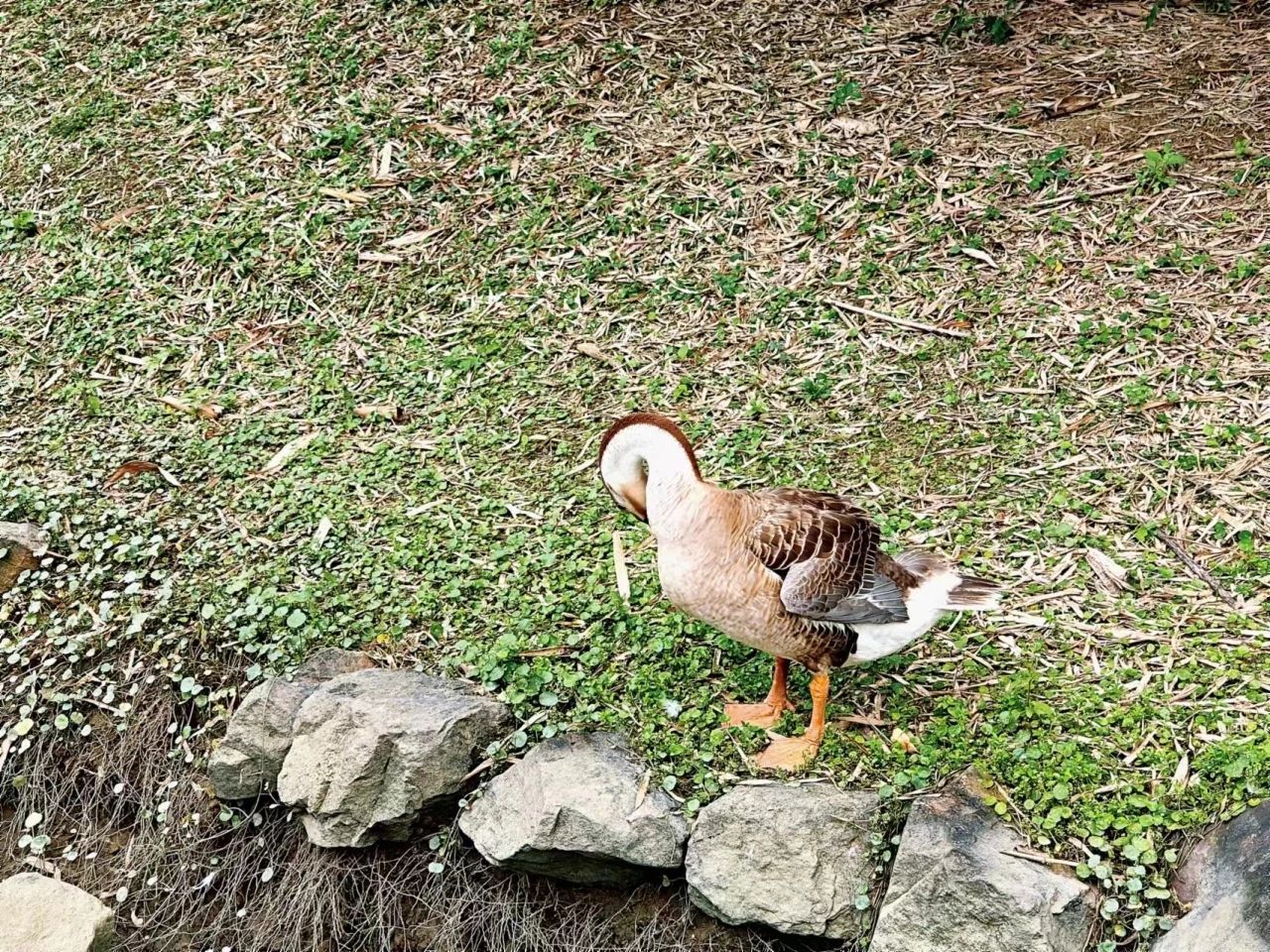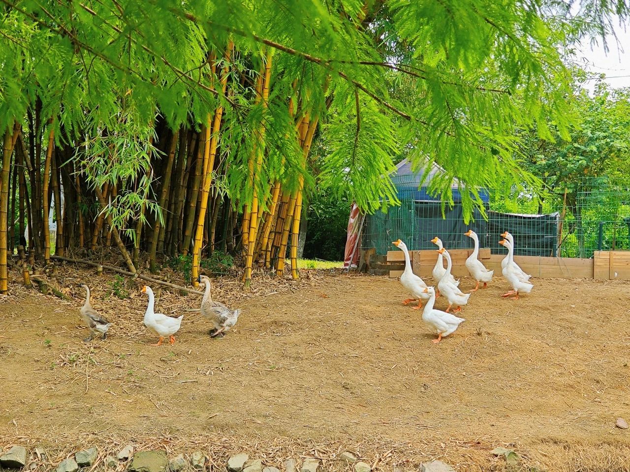 白鹅在水边与对岸的翠绿伫立相望