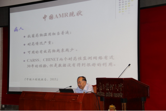 名誉教授授聘仪式结束后,陈君石院士围绕“食源性抗菌物耐药性”作主题为“细菌耐药性 (AMR) 控制−全球和中国”的学术报告,他在报告中指出细菌耐药性是当前对全球公共卫生最复杂的威胁,并介绍了WHO全球行动计划及其途径。重点阐述了我国细菌耐药性的现状,特别是在动物、食品及空气等三类基质中的问题与挑战。最后,陈院士指明了我国在细菌耐药性方面亟需开展的研究。