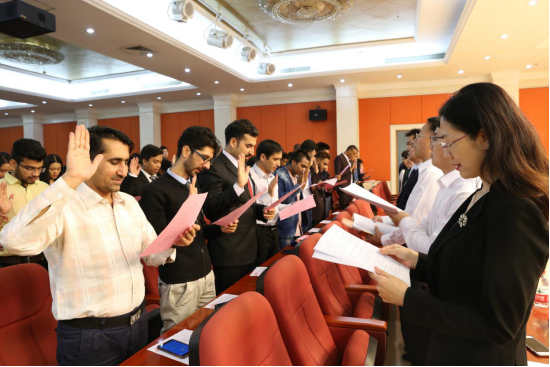 研究生新生代表、约旦籍留学生欧萨马用流利的中文讲述了自己的国家因中国“一带一路”政策而发生的变化,和自己来中国学习的经历。他希望大家用心学习中国语言和文化,成为传播中国文化的使者。