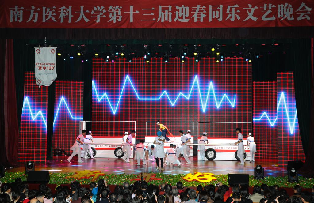 颁奖仪式结束后,南方医院呈现的序曲《潮起南医•春满南方》中,杂技和舞蹈刚柔相济,相得益彰,美轮美奂,气势浩大,拉开了迎春同乐晚会的序幕。外国语学院的歌曲联唱《相逢如歌》,演员们身上动人的橄榄绿,让大家穿越到南方医科大学前身第一军医大学那段难忘的军旅岁月。口腔医院表演的古典舞《一念花开》,诉说着一心一弦一拨乱,一花一念一梦间,青春不老,莫负流年。