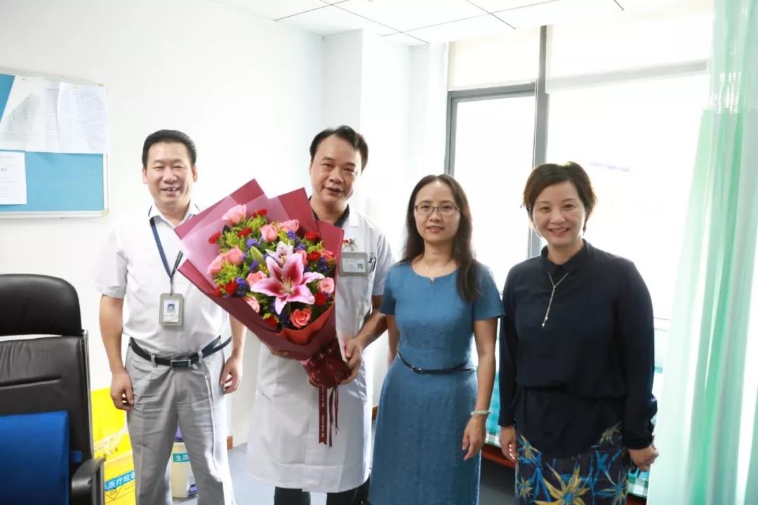 谢岩梅一行在皮肤病医院党委书记、院长杨斌,院党委副书记、工会主席郑道城等的陪同下,来到临床一线,向梁云生、罗光浦、何仁亮等优秀医师代表送上鲜花和慰问金,并与他们亲切交谈,了解他们的工作生活状况。