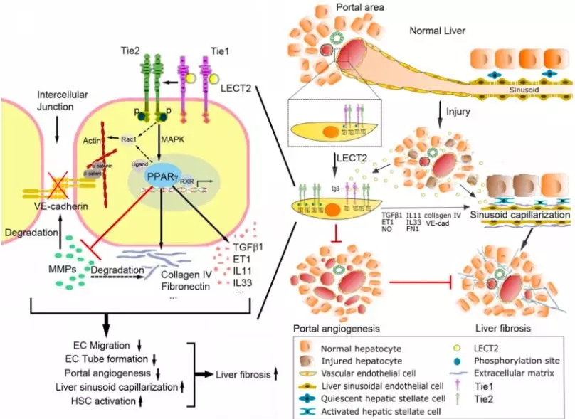 Tie(tyrosine kinase with immunoglobulin-like and epidermal growth factor homology)家族酪氨酸激酶受体主要由Tie1、Tie2组成,最初于1992年被报道。它们被认为在血管新生和稳态维持中发挥重要作用,也一直被认为是血管内皮细胞的标志物。其中Tie2的功能和机制研究的比较成熟,与多个配体结合调控血管新生和稳态维持,在发育和多种疾病中扮演重要角色。Tie1的功能也非常重要,其基因敲除小鼠会导致中晚期胚胎发育因严重的出血和微血管异常而致死,但它的配体一直未被找到,二十多年来一直作为孤儿受体(orphan receptor)存在,其下游调控机制也不清楚,Tie1在肝纤维化进程中的作用和机制此前未见报道。LECT2是一个分子量约16KD的分泌蛋白,最初作为炎症细胞诱导因子被报道,参与多种生理病理进程,其在肝纤维化进程中的作用和调控机制此前尚不明确。