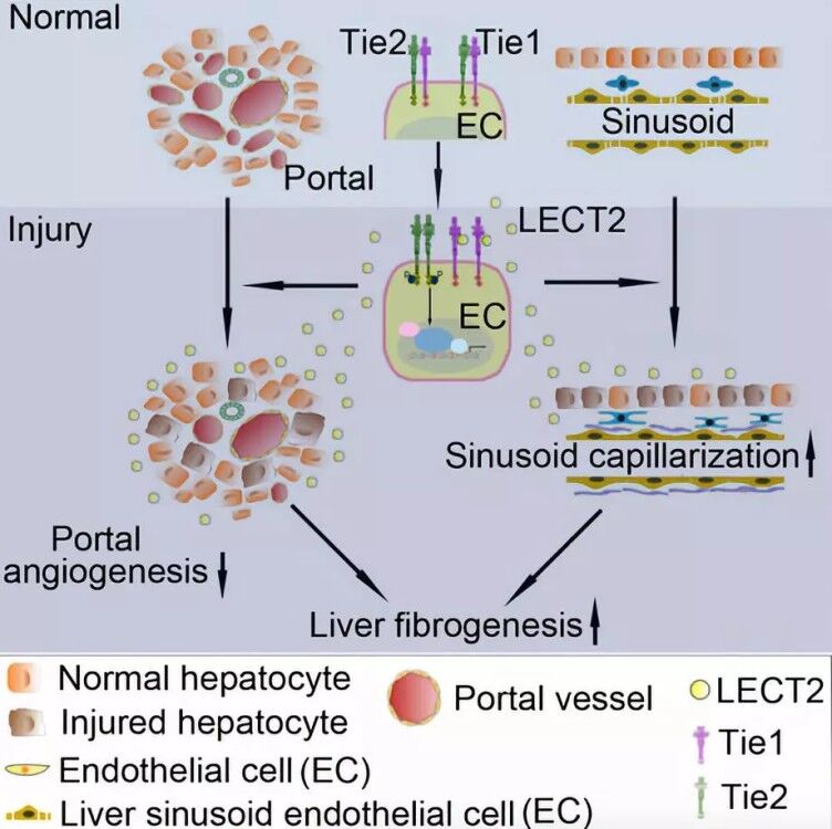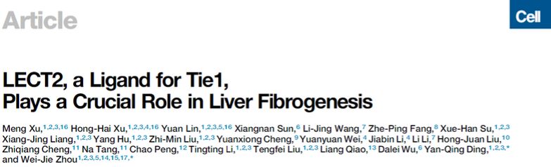 2019年8月29日,南方医科大学周伟杰教授带领其团队成员在Cell杂志上在线发表了题为LECT2, a Ligand for Tie1, Plays a Crucial Role in Liver Fibrogenesis的研究论文,揭示了LECT2-Tie1信号通路通过调控肝脏门脉血管新生和肝血窦毛细血管化进而调控肝纤维化进程的新机制,并提出了应区别对待门脉血管新生和肝血窦毛细血管化在肝纤维化进展中的不同作用的新观念。