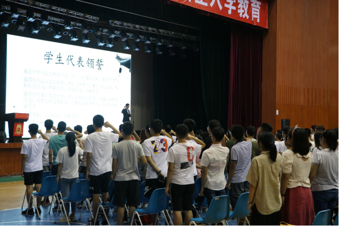 字字有力,铿锵有声。在听完父母心声后,博雅书院全体新生在新生代表叶平的带领下,高举右手,庄严宣誓:“在十八岁成人之际,我庄严宣誓:我要肩负起公民的使命,维护法律尊严,履行公民义务,承担社会道义;勤勉自励,奋发有为,奉献社会。我要肩负成年人的责任,用信心对自己负责,用诚心对他人负责,用孝心对父母负责,用热心对社会负责,用忠心对国家负责。天地为鉴,十八而志,青春万岁!”