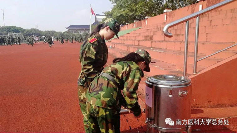 军训期间由于人数众多,就餐时间集中,这就给顺德校区学生食堂的餐饮保障工作带来不小的难度。食堂全体员工做足充分准备:从物资采购到加工存放,从人员配置到岗位分工,从供餐方案到防暑降温凉茶供应都做了细致的安排,确保新生军训工作的顺利进行。