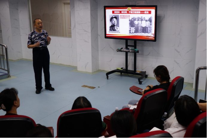 滕飞从平江起义及红五军保卫井冈山事迹讲起,围绕“共产党员的担当”、“家庭、家教、家风”、“不忘初心、牢记使命”三个方面展开了讲座。