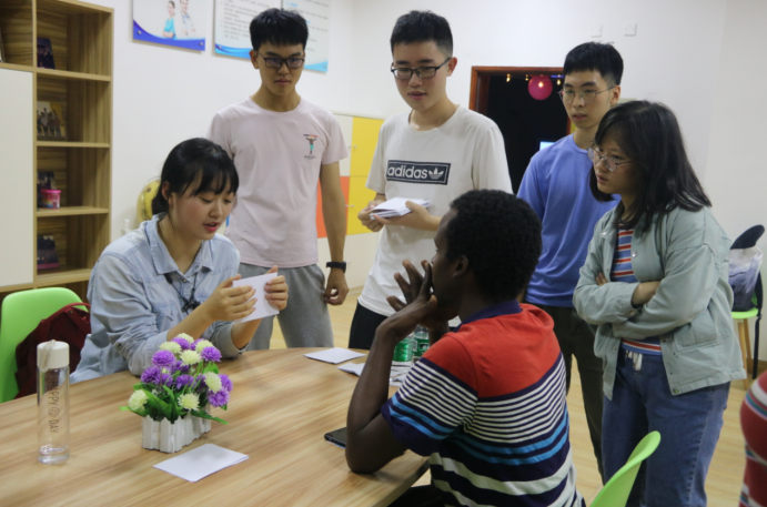在暖场活动的同时,各功能房内的闯关游戏也在有条不紊地进行着。解忧斋内的“头脑风暴”和“你画我猜”游戏难度适中,主要考验的是同学们的英语表达能力,同时也考验队友之间配合的默契程度;学思阁中的“爱的魔力转圈圈”和“嘴动手不动”则是考验同学们能否在运动过后,还能保持比较清晰的英语思维,难度系数较低,属于送分题;游戏难度最高的,当属求索阁中的“一站到底”。高难度的题目加上刺激的抢答模式,不仅考验同学们的英语知识储备,还考察他们的抗压能力。面对这些英语游戏的重重考验,同学们既紧张又兴奋,他们或绞尽脑汁使自己的表述更清楚,或努力让自己冷静下来去思考问题的答案,又或是全神贯注去看清每个问题。全情的投入、激烈的对战让整个活动的氛围瞬间被推到高潮。