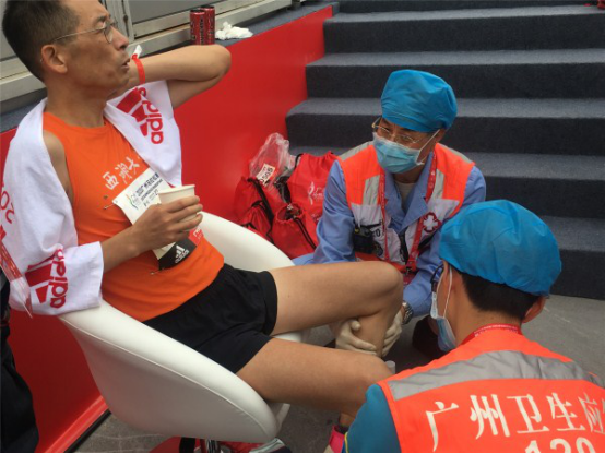 医疗队员们凌晨4点集合,5时许,医疗队按照要求准时到达指定医疗点区域-全马终点,此区域保障任务重,救治压力大。医疗队员们认真清点物品,布置医疗点,丝毫不敢松懈。医疗队员们熬来了日出,熬走了寒气,随着广马的开跑,渐渐的忙碌起来......腿部抽筋的,乏力虚脱的、体力不支的、肢体擦伤的......队员们快速反应,从容应对,以专业的技能,高超的应急处理能力,迅速控制伤情,避免伤员受到二次伤害。