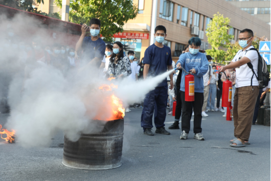 新员工正在学习正确使用灭火器