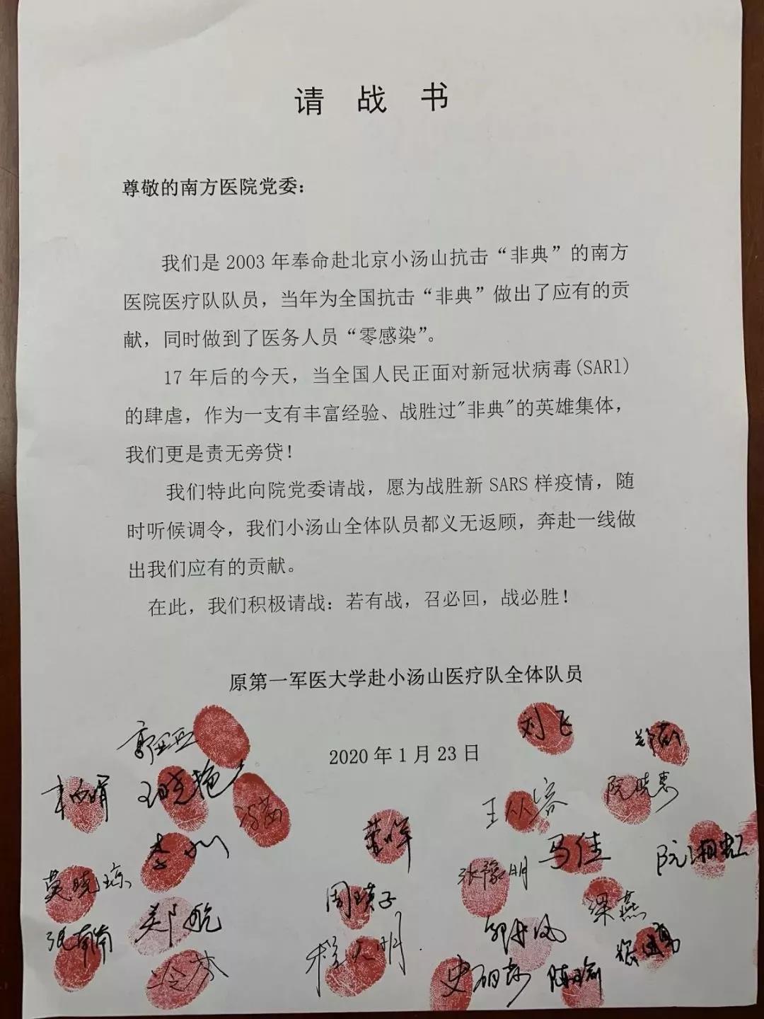 这段时间,“抗非老兵”们的战斗热情再次被点燃。神经外科护士长王晓艳率先在群里起草一份请战书,主动要求赴防治一线工作。她的倡议得到了24名小汤山队员的热情响应,大家纷纷签字,按下鲜红的指印,请战抗击新型肺炎。