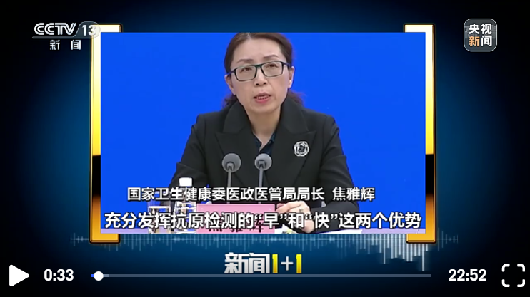 央视《新闻1+1》主持人董倩:众所周知核酸检测是检验是否感染新冠病毒的一个金标准,而且在我们国家核酸检测的能力是十分强大的。既然如此,我们为什么还要增加一种新的抗原检测这样的一种检测方式?接下来我们连线南方医科大学公共卫生学院的赵卫教授。赵教授,您怎么看待在这样的一个病毒快速传播的时间节点,采用增加抗原检测这样一种新的检测方式?公共卫生学院赵卫教授:我觉得之…